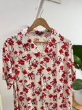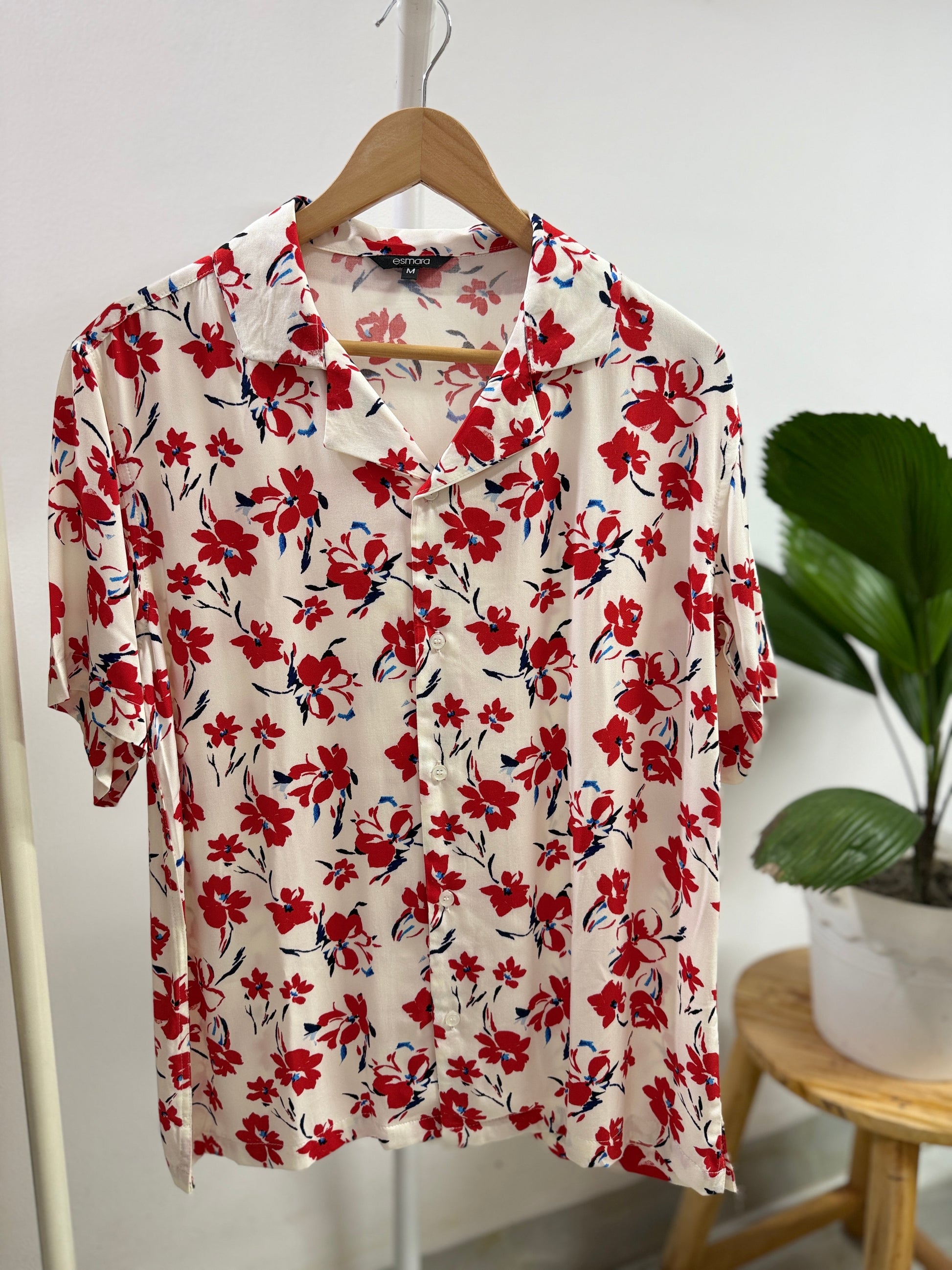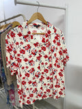 Fresh and feminine, the Zyna Blossom Breeze Shirt features vibrant red floral prints on a soft cream background—perfect for effortless summer style.